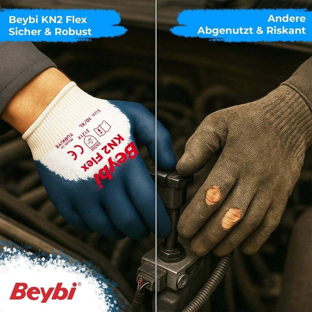 KN2-Handschuhe liegen besser in der Hand und bieten durch ihre baumwollgefütterte Textur, das Strickbündchen und die spezielle Form einen hohen Tragekomfort. Er ist widerstandsfähiger gegen Abrieb und Reißen.