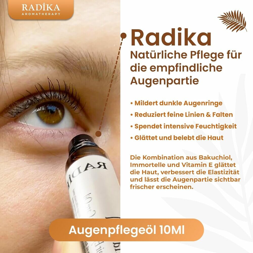 Die hochwirksamen ätherischen Öle dringen tief in die Haut ein und wirken auf zellulärer Ebene. Sie balancieren den Feuchtigkeitshaushalt aus, verbessern die Hautstruktur und verleihen der Augenpartie ein frisches, jugendliches Aussehen.