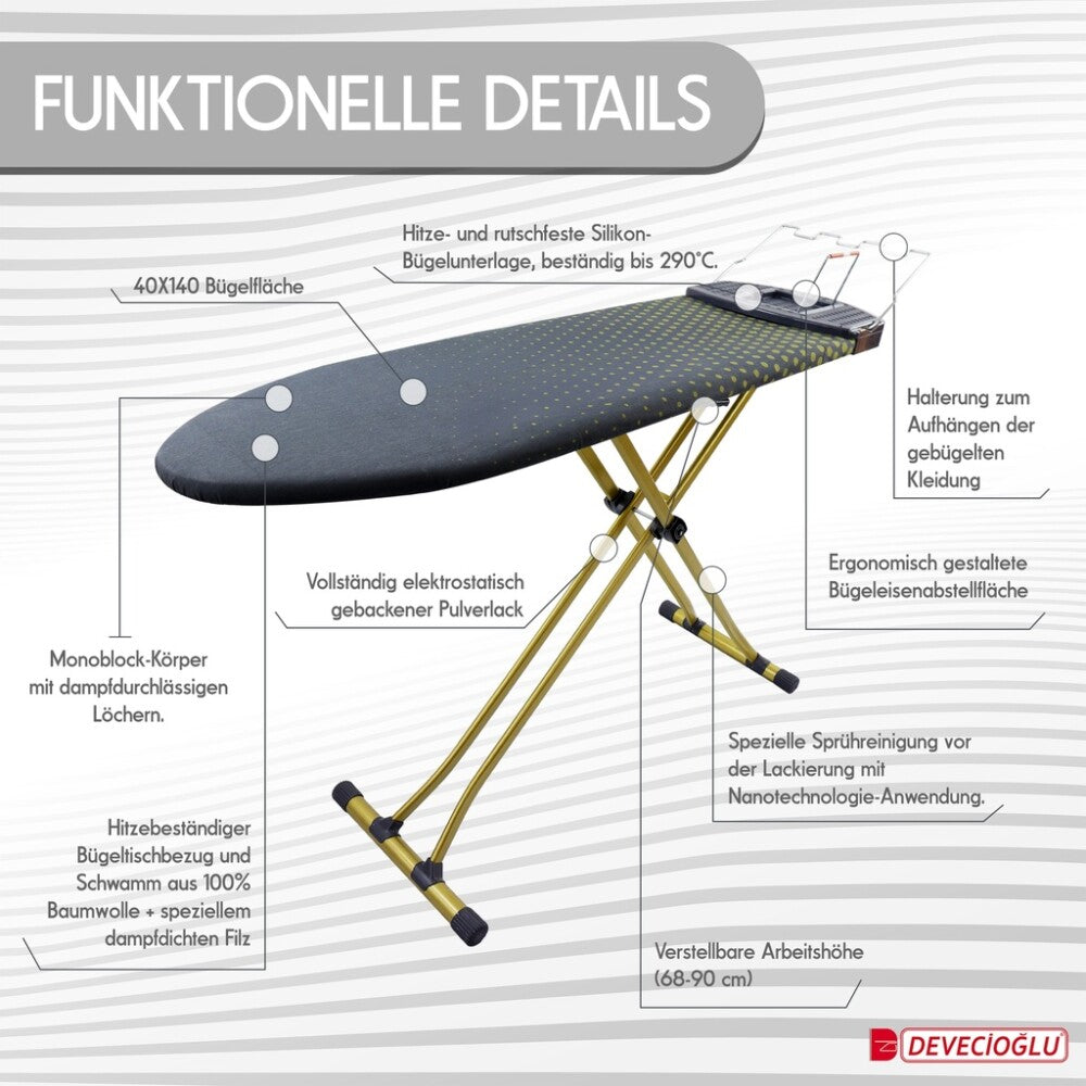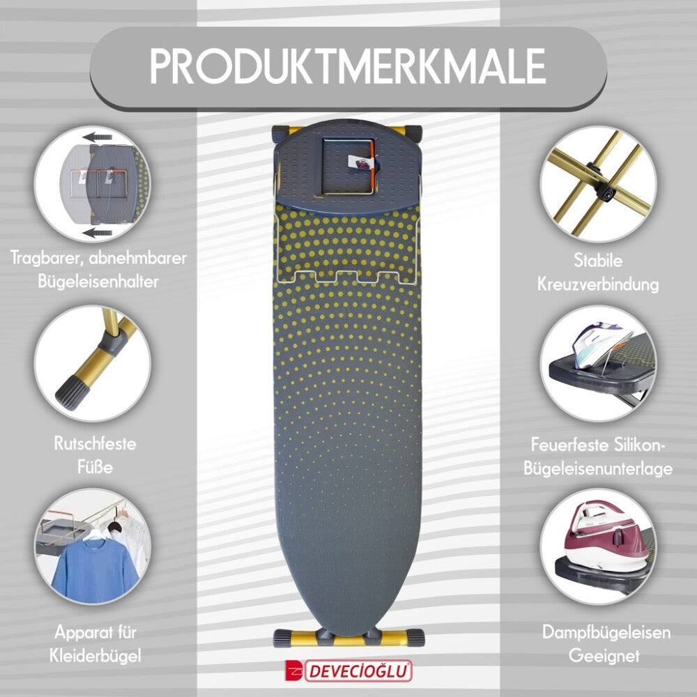 Bügelbrett, Bügeltisch, Bügelbrettbezug 40x140cm, Höhe 68-90cm, Grau, Goldfarbig