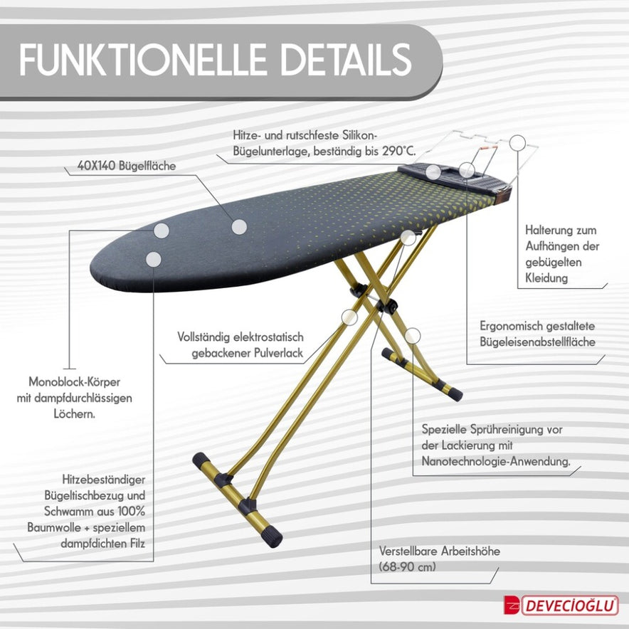 | Tags: | Bügelbrett, Bügelbrettbezug 40x140cm, Bügeltisch, Goldfarbig, Grau, Höhe 68-90cm, |