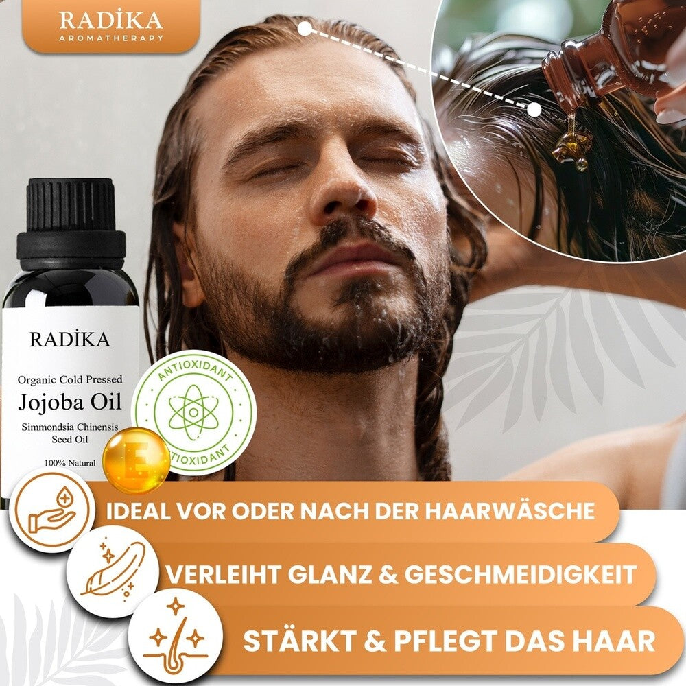 Das wichtigste Merkmal, dass sich das Jojobaöl von anderen Ölen unterscheidet, ist, dass es zwar flüssig ist, aber eher eine Wachsstruktur als ein Öl hat. Von seiner Zusammensetzung her reguliert es die Talgproduktion der Haut, da es eine sehr ähnliche Struktur wie der natürlich von der Haut produzierte Talg hat. Jojobaöl, das Vitamin E enthält, ist oxidationsbeständig. Es wirkt der Faltenbildung auf der Haut entgegen. Durch seinen Gehalt an Vitaminen und Mineralien dringt es tief in die Haut ein, spendet Feuchtigkeit und hilft, der Faltenbildung vorzubeugen, indem es die Elastizität der Haut erhöht. Jojobaöl ist ein sehr nützliches Öl für die Haare. Es trägt zur Verringerung der Trockenheit der Kopfhaut bei, indem es die Kopfhaut mit Feuchtigkeit versorgt. Es hilft, die Schuppenbildung im Haar zu verhindern. Es trägt zur Verringerung des stumpfen Aussehens der Haare bei und unterstützt das Haar, gesünder und lebendiger auszusehen.