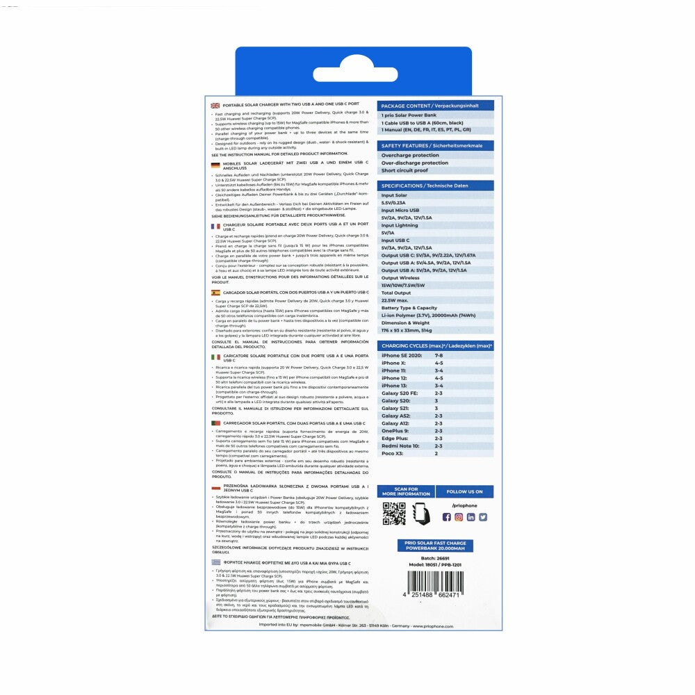 - 1x Prio Fast Charge Solar Power Bank 20000mAh (22,5W SCP/20W PD/QC3.0)