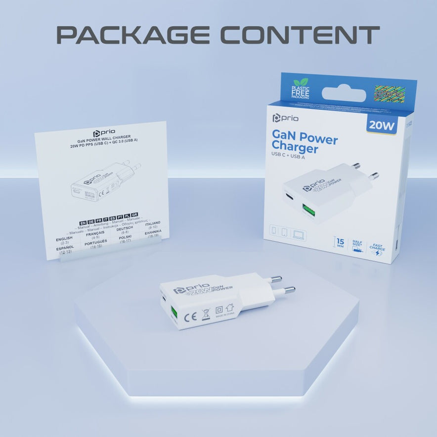 prio Wandladegerät GaN POWER 20W PD PPS (USB C) + QC 3.0 (USB A) weiß