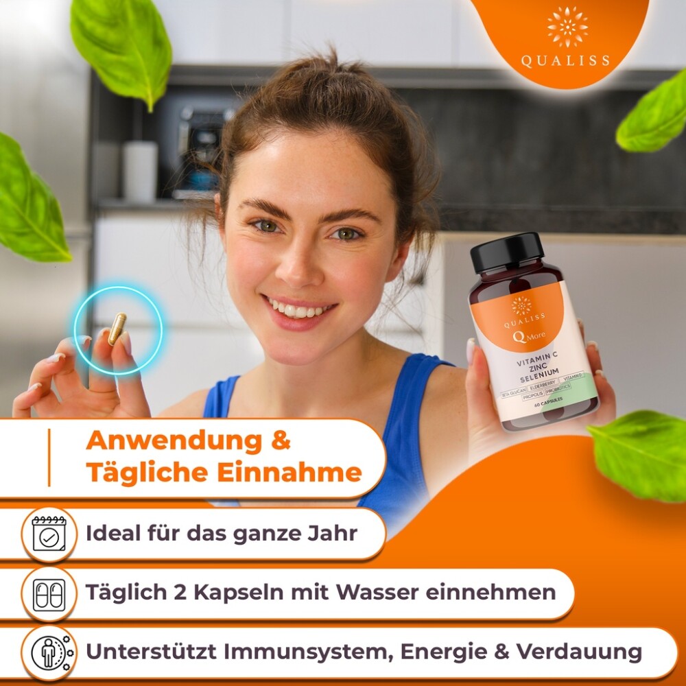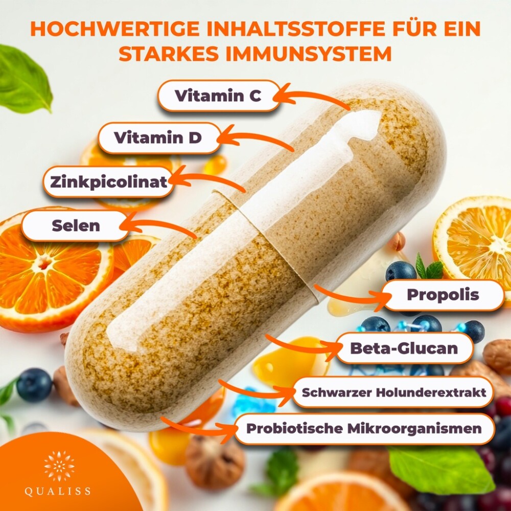 Qualiss® Vitamin C | Immunsystem stärken Erwachsene | Vitamin D und Zink | Probiotika | Stoffwechselunterstützung | 60 Kapseln | Acht Inhaltsstoffe in einer Kapsel