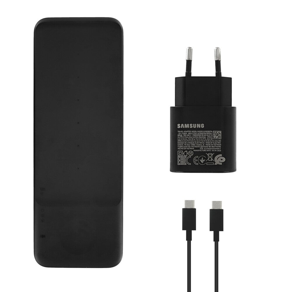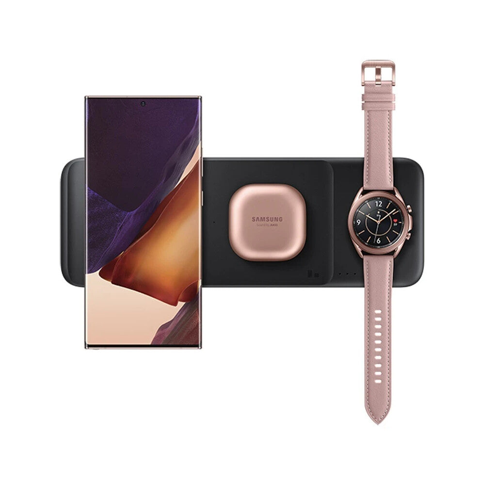 Funktionen ; - Samsung 9W kabelloser Ladeständer. - Lädt Ihr Telefon, Ihre Smartwatch und Ihre Ohrhörer gleichzeitig auf. - Kompatibel mit Qi-zertifizierten Geräten bis 5 W. - Unterstützt Apple-Geräte, die bis zu 7,5 W laden. Das Paket beinhaltet ; - Samsung Trio kabelloses Ladegerät - 25-W-Reiseadapter - USB-C-Kabel - Benutzerhandbuch