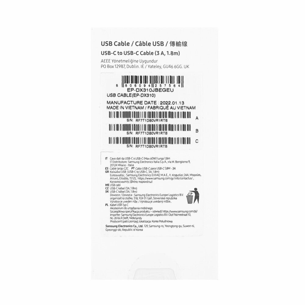 Echtes Samsung USB-C / USB-C Kabel EP-DX310 - 3A, 1.8mMit dem original Samsung USB-C auf USB-C Kabel können Sie eine sichere Verbindung herstellen, während Sie Ihr kompatibles Gerät aufladen. Es unterstützt Power Delivery mit bis zu 60 W und Super Fast Charging mit bis zu 25 W. Und mit einer Ausgangsleistung von bis zu 3 Ampere und 20 Volt können Sie eine zuverlässige und schnelle Ladung genießen.Merkmale:- Original Samsung USB-C auf USB-C Kabel sorgt für zuverlässiges und schnelles Laden- Bis zu 3A und 20V Ausgangsleistung zum Laden von USB-C Geräten- Unterstützt Power Delivery bis zu 60W und Super Fast Charging bis zu 25W*- Umkehrbare Typ-C-Stecker ermöglichen den Anschluss des Kabels in beide Richtungen- Dieses hochwertige Samsung Type-C Kabel ist 1,8m lang- Datenaustausch ist über USB 2.0 möglich* Erfordert einen kompatiblen Schnellladeadapter.