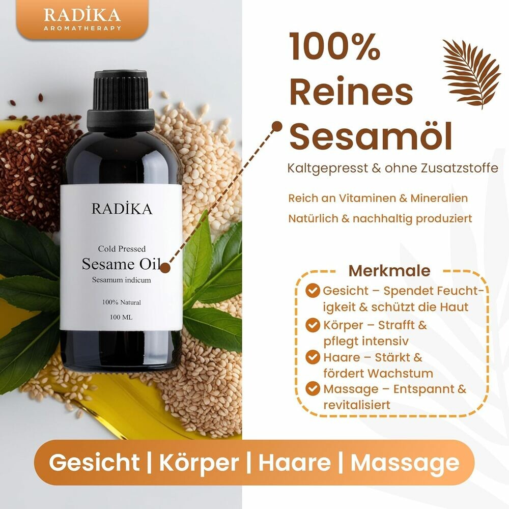 Sesamöl ist reich an den Vitaminen E und B und Mineralien wie Kalzium, Magnesium und Phosphor. Es hat viele Vorteile für Haut, Haare, Nägel, Zähne, Knochen und die allgemeine menschliche Gesundheit. Es nährt die Haut und spendet ihr Feuchtigkeit. Es ist bekannt, dass es die Zellen vor vorzeitiger Alterung schützt und die Haut weicher macht. Es wird verwendet, um die Bildung von Cellulite zu verhindern. Es hilft, die Gesundheit von Haaren, Augenbrauen und Wimpern zu schützen, gesund und üppig zu sein, Schuppen- und Pilzbildung zu verhindern.