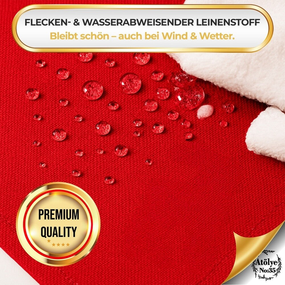 - Material: Roter, fleckenabweisender und wasserabweisender Leinenstoff mit goldenen schimmernden Akzenten.
