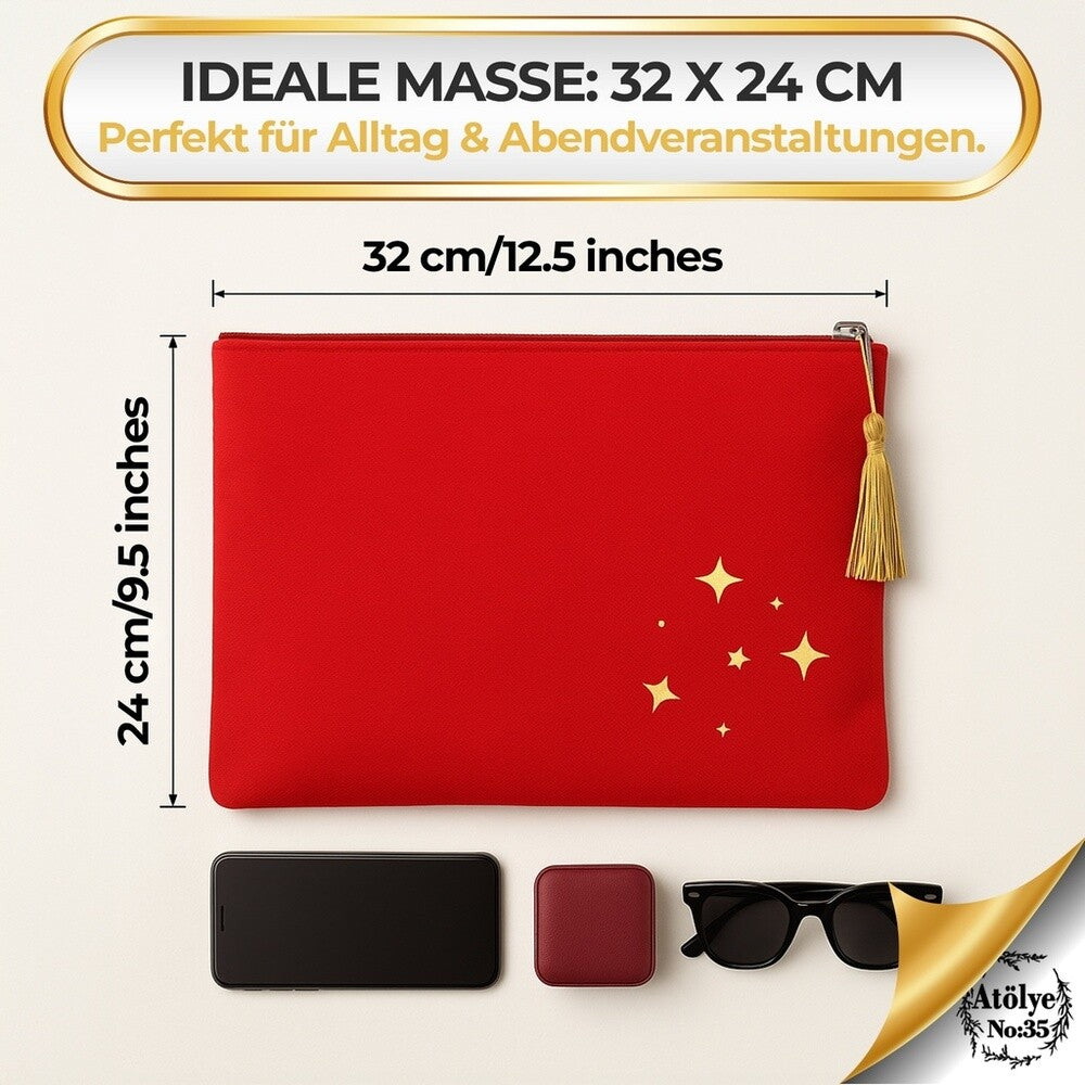 Erleben Sie die perfekte Kombination aus Weihnachtsstimmung und Eleganz mit dieser roten Clutch Tasche. Die goldfarbenen, schimmernden Akzente und die stilvollen Details machen sie zu einem wahren Hingucker. Der wasser- und fleckenabweisende Leinenstoff bietet nicht nur praktische, sondern auch ästhetische Vorteile. Der goldene Quastendetail am Reißverschluss und das goldene Innenfutter runden das raffinierte Design der Tasche ab. Diese Clutch ist sowohl für den Alltag als auch für besondere Anlässe ein elegantes Accessoire.