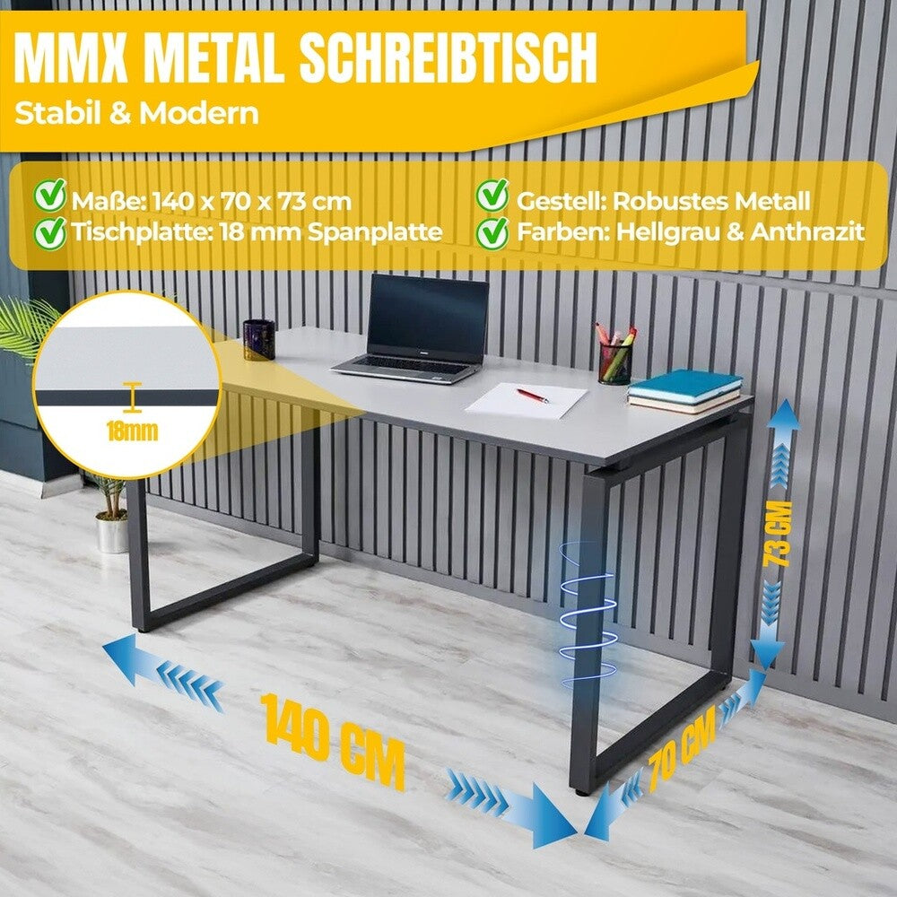 MMX METAL Schreibtisch aus Metall, Hellgrau farbene Platte und schwarzes Gestell, Computertisch, einfache Montage, 140 x 70 x 73