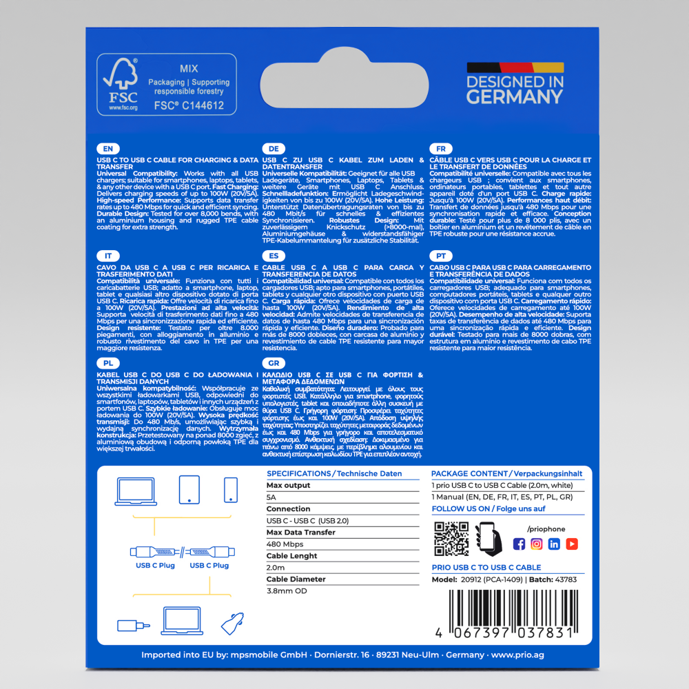 prio Lade- und Datenkabel USB C auf USB C 2,0 m weiß