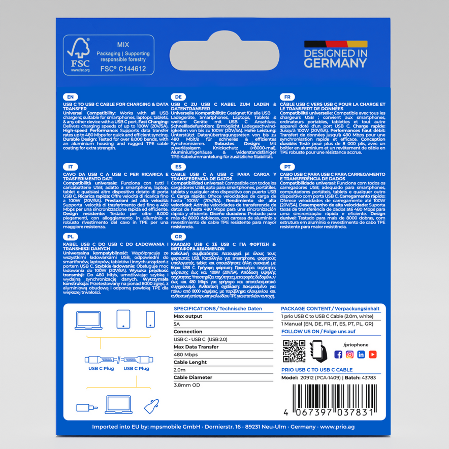 1x Prio Lade- & Datenkabel USB C auf USB C 2,0m weiß;