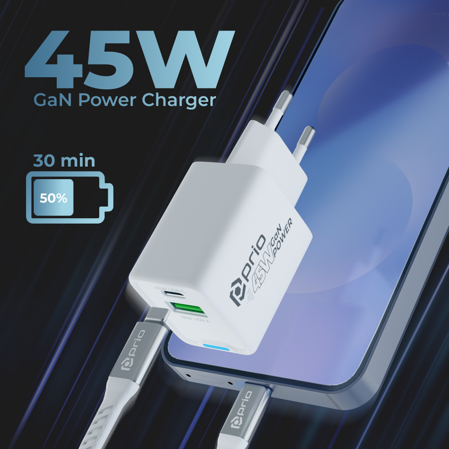 prio Wandladegerät GaN Power 45W PD PPS (USB C) + QC 3.0 (USB A) weiß