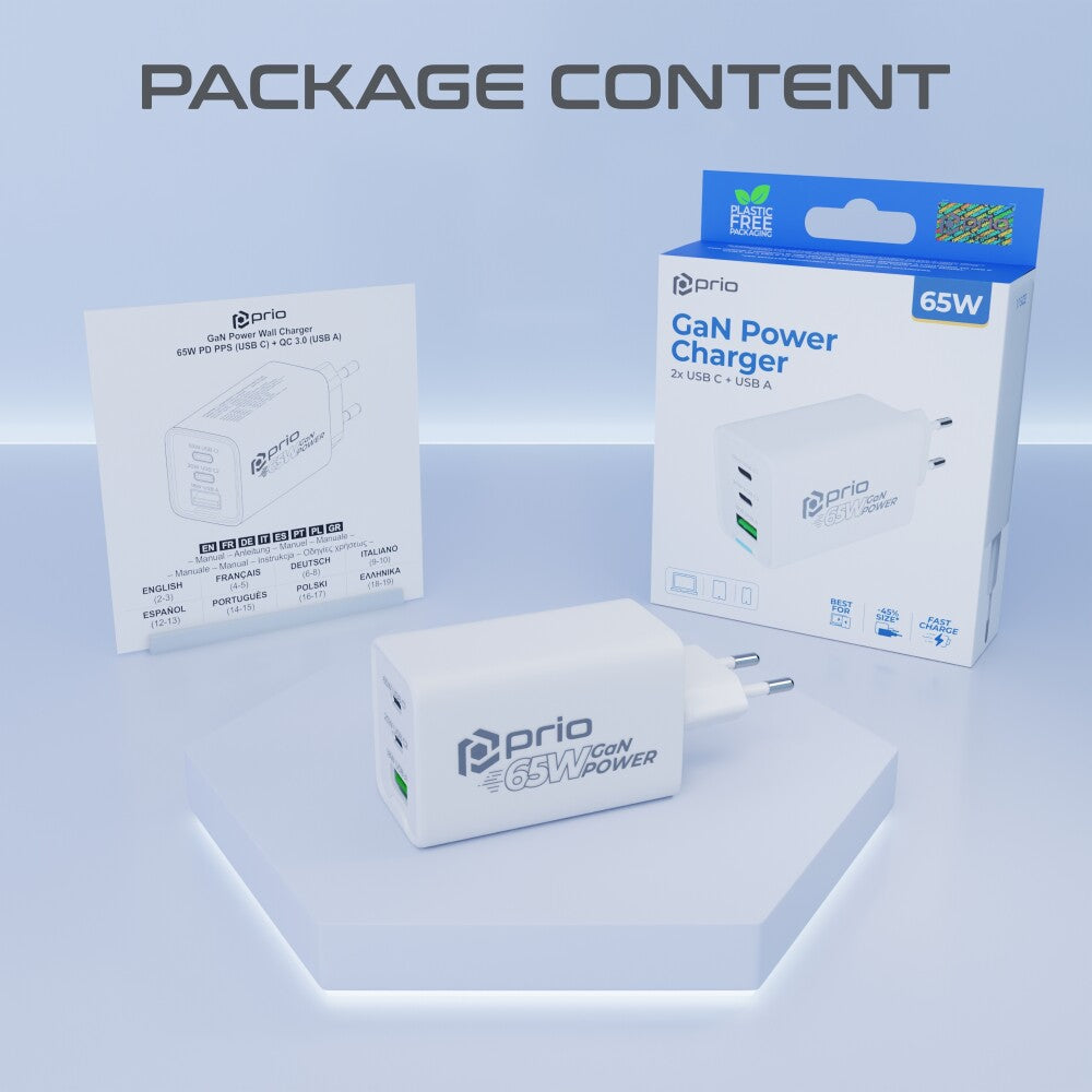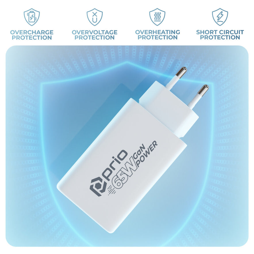 prio Wandladegerät GaN Power 65W PD PPS (USB C) + QC 3.0 (USB A) weiß