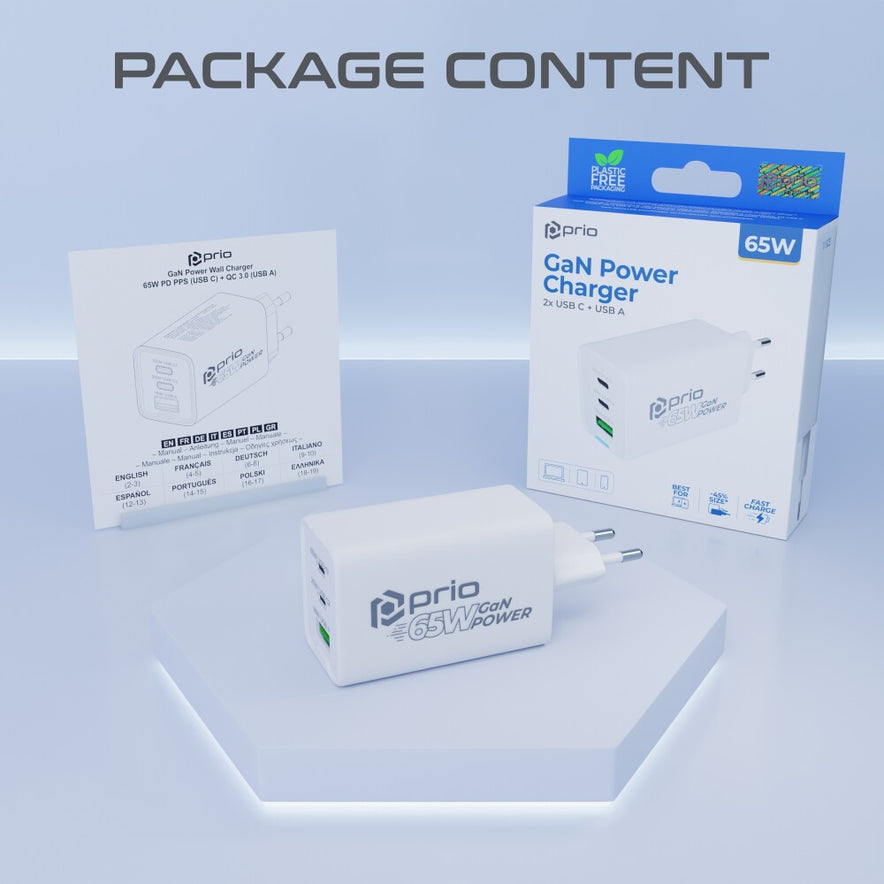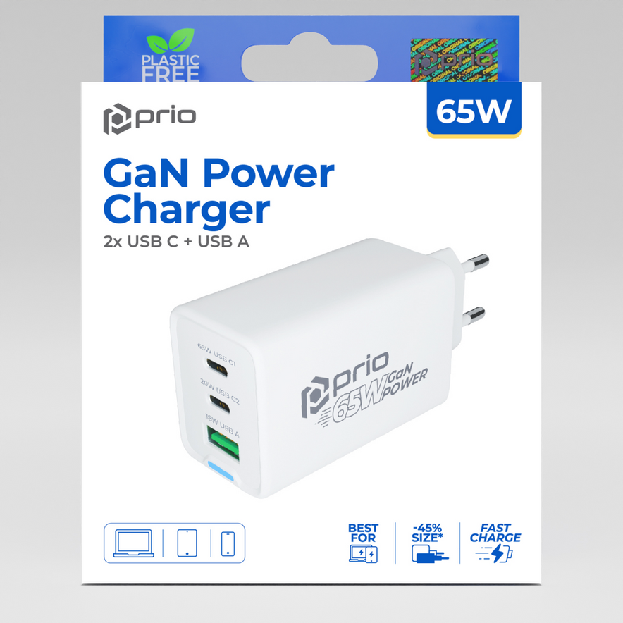 prio Wandladegerät GaN Power 65W PD (USB C) + QC 3.0 (USB A) weiß