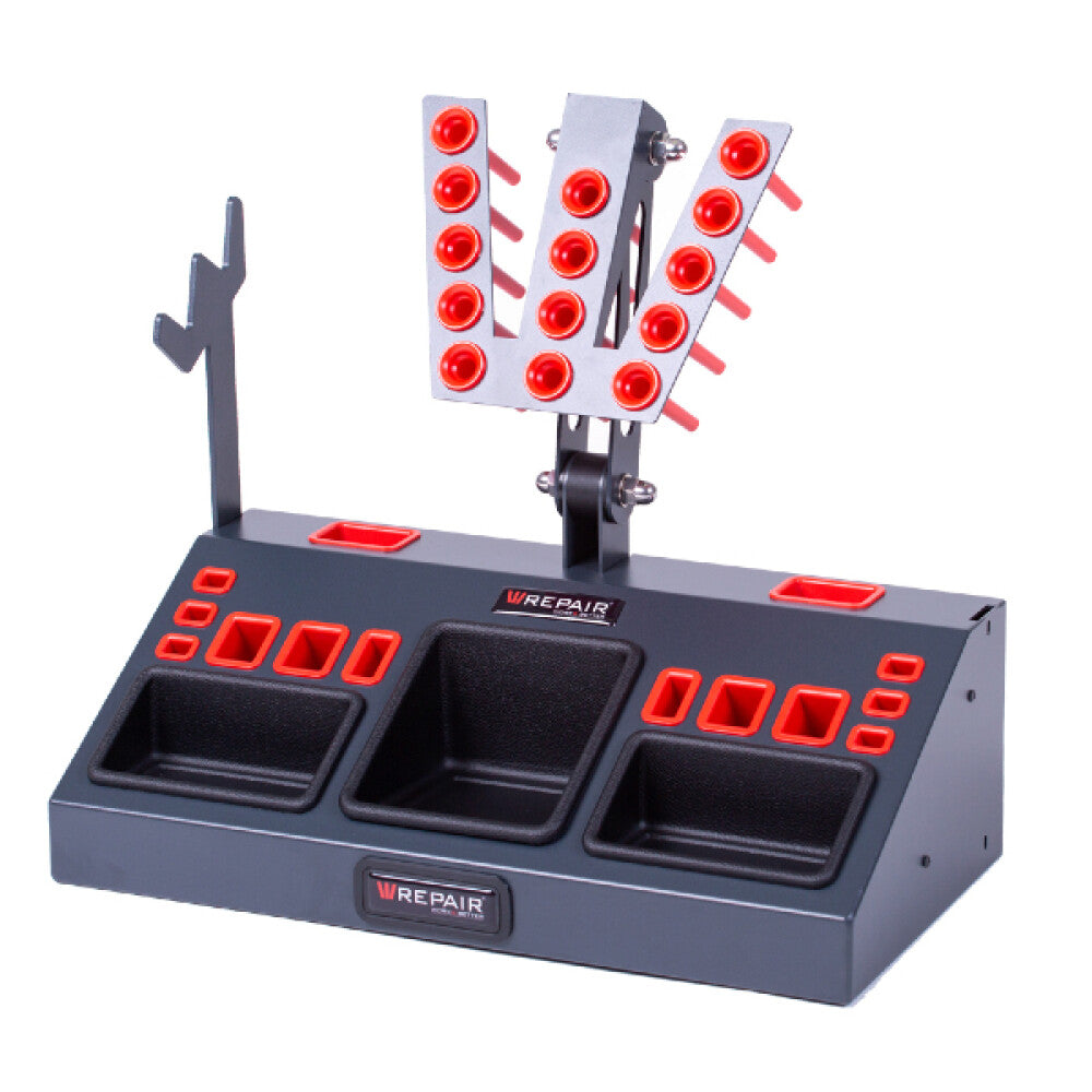 - Platz für bis zu: 14 Schraubendreher, 6 Pinzetten, 2 Zangen (mit zusätzlicher Zangenhalter 4X), 2 Scheren, 2 Öffnungshocker, 1 Heißluftgewehrhalter, 1 Blechspender, 12+ Verschiedene Instrumente, 3 Ablagefächer.